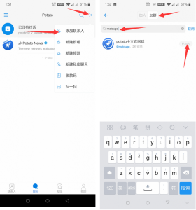 加群方式,打开potato点击右上角加号+,选择添加联系人,然后点击顶部加群,输入群IDmatouge,点击搜索,然后加入就行了。记得iD别填写错了